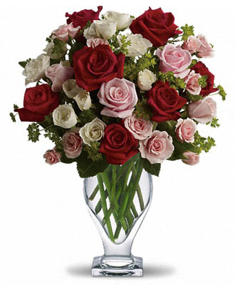This flower bouquet features an exquisite and delicate assortment of red and pink roses, white and light pink spray roses, and lush greens that radiate with beauty and magnificence.